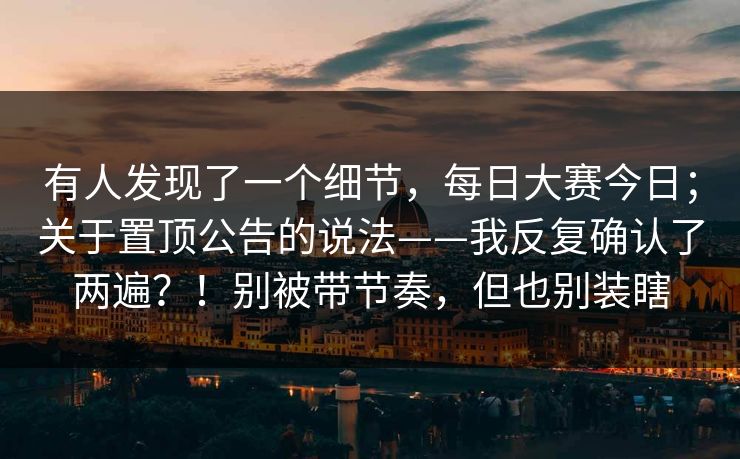 有人发现了一个细节,每日大赛今日;关于置顶公告的说法——我反复确认了两遍?!别被带节奏,但也别装瞎 今天社区里突然热闹起来:有人在置顶公告里找到一个“细节”,立刻引发了大量转发和议论,很多人开始以此为依据做出结论,甚至有人在群里带节奏。作为关注此事的人,我把公告、历史记录和相关证据都核对了两遍,下面把查证过程、结论和给大家的建议整理清楚,方便大家理性判断与应对。 我发现的“细节”是什么 一个用户发现置顶公告里某处短语在不同时间显示不一致(括号内的备注或一行小字在刷新后消失或位置变化)。 这种看似微小的差别被部分人解读为“规则被悄悄改了”“比赛时间被调整”“管理员在做手脚”等等...